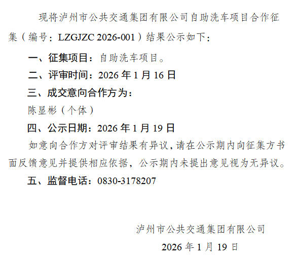 瀘州市公共交通集團(tuán)有限公司自助洗車(chē)項(xiàng)目合作征集結(jié)果公示